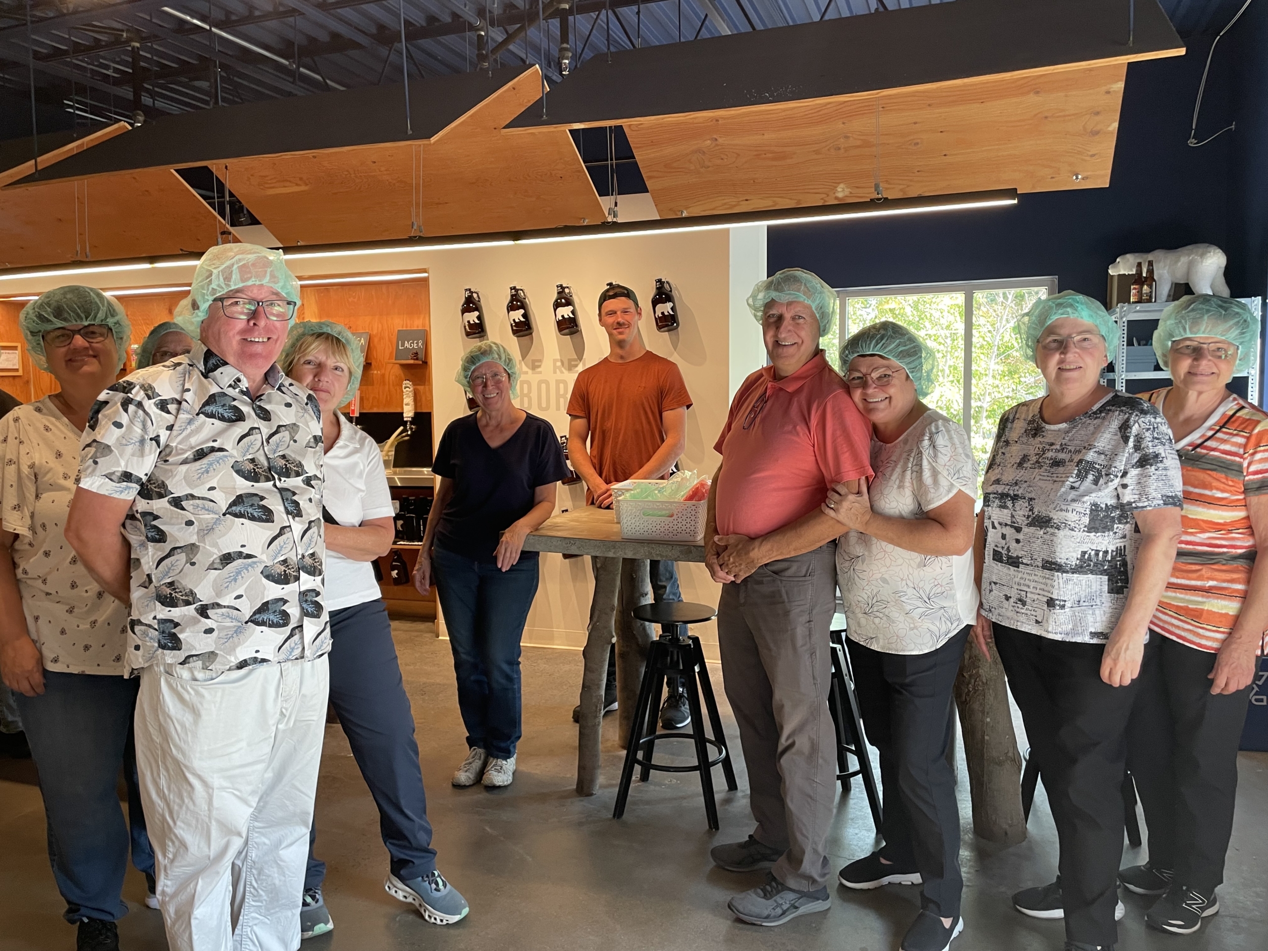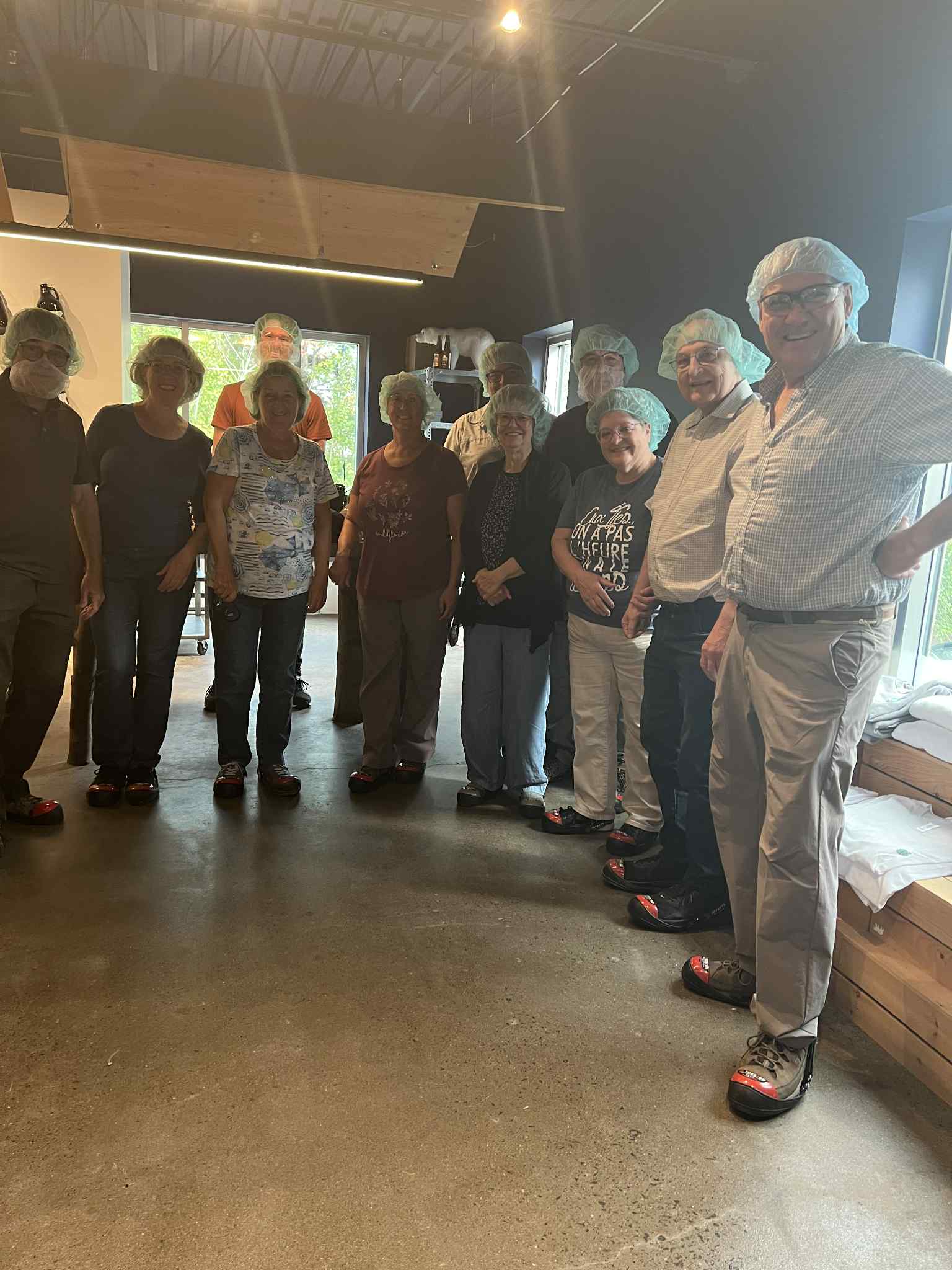 Avant la visite, pour une question de sécurité, chaque participant a dû protéger ses cheveux d’un filet et certains même pour la barbe. On a aussi enfilé des couvre-chaussures avec des caps d’acier. Ainsi équipés, nous avons pu faire le tour de l’usine et voir le processus du début à la fin. C’était impressionnant de voir le processus du remplissage des cannettes sur la chaîne de remplissage. Plusieurs ont été surpris par la grosseur des cuves, ainsi que par le nombre. Nous avons vu un robot en fonction, qui s’occupe de mettre les boîtes sur les palettes. L’animateur Antoine a dû répondre à plusieurs questions des participants. Un employé nous a fait la démonstration du remplissage des barils qui sont utilisés par les commerces pour la bière en fût. La visite se terminait par l’entrepôt, où l’on a pu voir des employés qui préparaient des commandes.